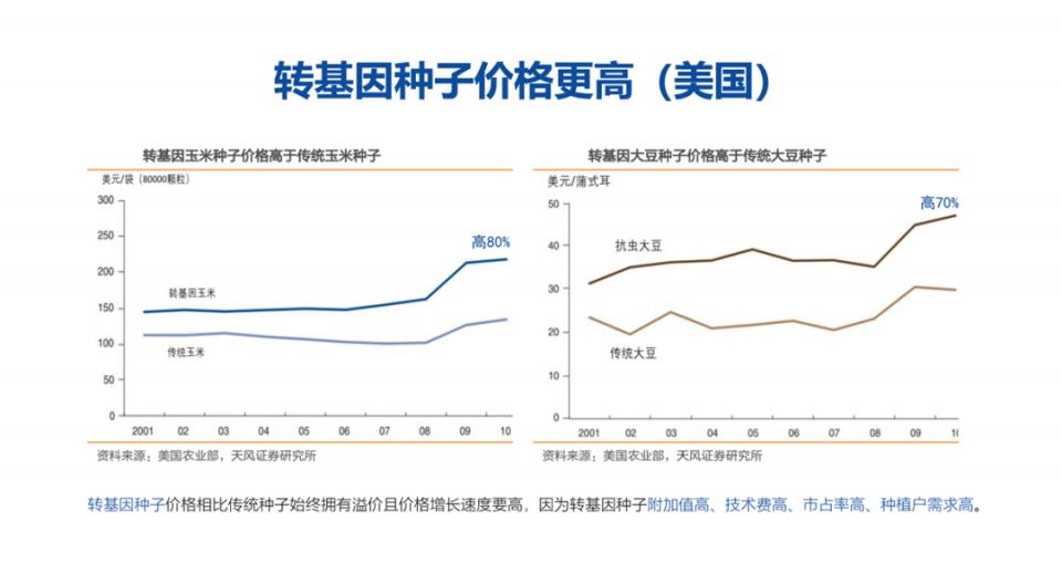轉(zhuǎn)基因種子價格相比傳統(tǒng)種子始終擁有溢價目價格增長速度要高,因為轉(zhuǎn)基因種子附加值高、技術(shù)費高,市占率高,種植戶需求高。
