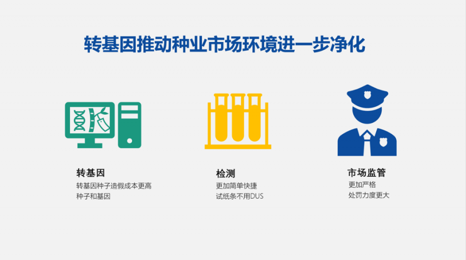 轉(zhuǎn)基因推動種業(yè)市場環(huán)境進一步凈化,轉(zhuǎn)基因種子透假成本更高(種子和基因);檢測更加簡單快捷,用試紙條即可,不用進行 DUS ;市場監(jiān)管更加嚴(yán)格,處罰力度更大。