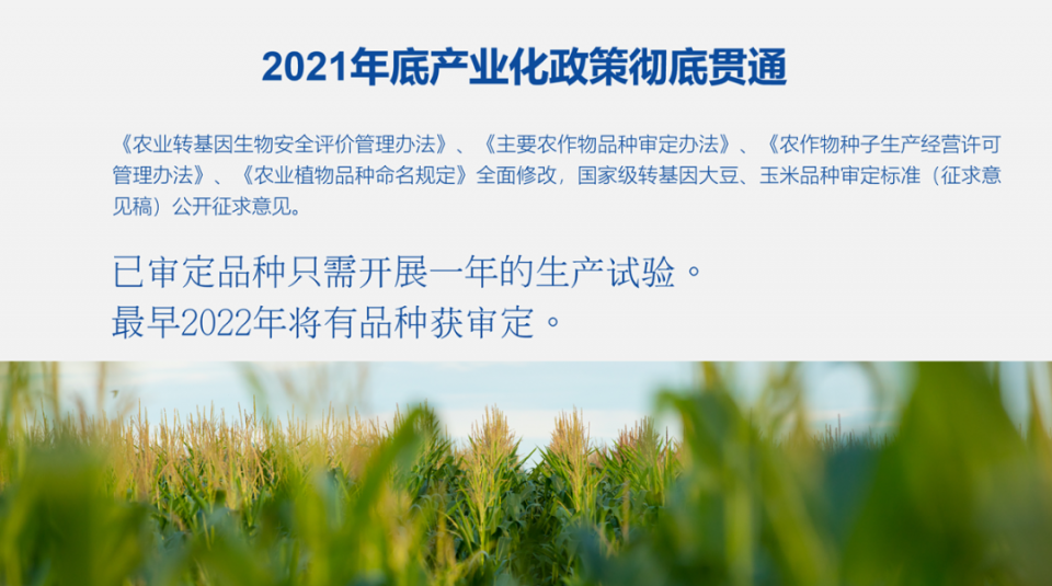 2021 年底產(chǎn)業(yè)化政策徹底貫通?!掇r(nóng)業(yè)轉(zhuǎn)基因生物安全評價管理辦法》,《主要農(nóng)作物品種審定辦法》、《農(nóng)作物種子生產(chǎn)經(jīng)營許可管理辦法》、《農(nóng)業(yè)植物品種命名規(guī)定》全面修改,國家級轉(zhuǎn)基因大豆、玉米品種審定標(biāo)準(zhǔn)(征求意見稿)公開征求意見。已審定品種只需開展一年的生產(chǎn)試驗,最早 2022 年將有品種獲審定。