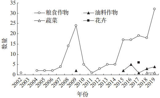 圖4和圖5分別展示了不同類型作物品種權(quán)申請量和授權(quán)量的年度變化情況,進(jìn)一步印證了申請和授權(quán)作物中糧食作物的絕對主導(dǎo)地位。蔬菜和花卉品種權(quán)申請分別開始于2015年和2014年,2017年首次獲得授權(quán)。在申請和授權(quán)時(shí)間上比糧食作物晚15年左右,比油料作物晚5年左右。