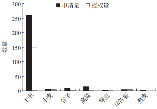 申請量和授權(quán)量差異大的問題不僅體現(xiàn)在不同類型作物上,還體現(xiàn)在糧食作物之間。如圖6所示,7種糧食作物中,申請量和授權(quán)量排名完全一致,排在前3位的分別是玉米、高粱和谷子。前3位中,排第1位的玉米品種權(quán)申請量高達(dá)259件,授權(quán)量達(dá)到147件,分別占糧食作物申請量和授權(quán)量的88%和86%,而排在第2位的高粱品種權(quán)申請量和授權(quán)量僅占4.8%和6.1%,與玉米相差80多個(gè)百分點(diǎn)。由此可見,處在第3位或之后的作物申請量和授權(quán)量所占比重可想而知。