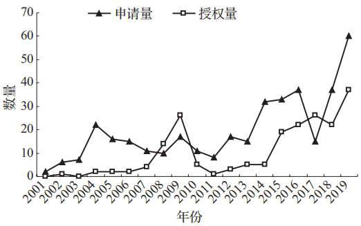 圖1 2001-2019年品種權(quán)申請量和授權(quán)量變化