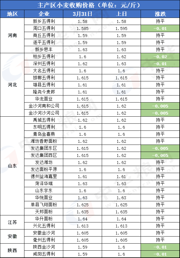 3月31日,小麥市場價格繼續(xù)下調(diào),河南多家面粉廠收購價格跌破1.6元/斤,山東河北1.6以上領(lǐng)地也在收窄(詳見文后價格)。