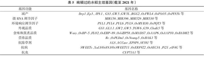 基因編輯依賴于經(jīng)過(guò)基因工程改造的核酸酶(分子剪刀),在基因組中特定位置產(chǎn)生位點(diǎn)特異性雙鏈斷裂,誘導(dǎo)生物體通過(guò)非同源末端連接或同源重組來(lái)修復(fù)特異性雙鏈斷裂,因?yàn)檫@個(gè)修復(fù)過(guò)程容易出錯(cuò),從而導(dǎo)致靶向突變,這種靶向突變就是基因編輯。基因編輯以其能夠高效率地進(jìn)行定點(diǎn)基因組編輯,被作物育種界寄予厚望。很顯然,基因編輯的前提是知道要編輯什么基因。因此,要編輯的基因都是主效基因,所不同的是,基因編輯的基因一般是育種不需要的非有利基因,期望它產(chǎn)生有利突變。迄今為止,分子遺傳學(xué)家對(duì)水稻基因編輯的主效基因列于表5。