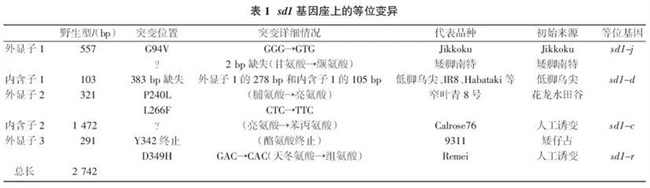 從表1可見,sd1基因座存在較多的等位變異,每個(gè)變異都影響赤霉素的生物合成,最終影響水稻的株高。