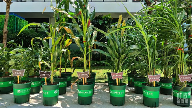△種子實驗室展示黑糯一號玉米(左二)、矮化釀酒高粱(左四)等。(總臺央視記者楊立峰拍攝)