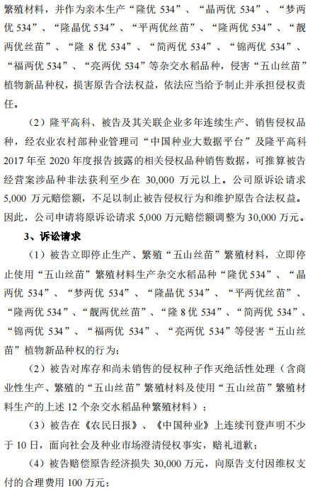 2021年7月,荃銀高科以湖南隆平侵害植物新品種權(quán)為由,向湖南隆平提起訴訟,并要求:(1)被告湖南隆平立即停止生產(chǎn)、繁殖“五山絲苗”繁殖材料,立即停止使用“五山絲苗”繁殖材料生產(chǎn)雜交水稻品種“隆優(yōu)534”12個(gè)等侵害“五山絲苗”植物新品種權(quán)的行為;(2)被告對庫存和尚未銷售的侵權(quán)種子作滅絕活性處理(含商業(yè)性生產(chǎn)、繁殖的“五山絲苗”繁殖材料及使用“五山絲苗”繁殖材料生產(chǎn)的上述12個(gè)雜交水稻品種繁殖材料);(3)被告在《農(nóng)民日報(bào)》、《中國種業(yè)》上連續(xù)刊登聲明不少于10日,面向社會及種業(yè)市場澄清侵權(quán)事實(shí),賠禮道歉;(4)被告賠償原告經(jīng)濟(jì)損失30,000萬元,向原告支付因維權(quán)支付的合理費(fèi)用100萬元;(5)被告承擔(dān)本案全部訴訟費(fèi)用。