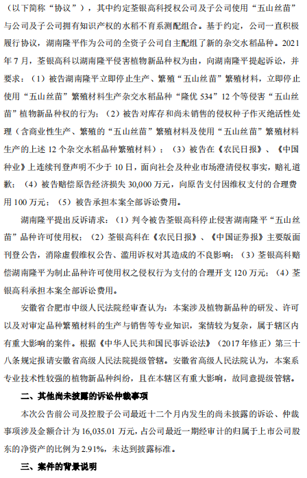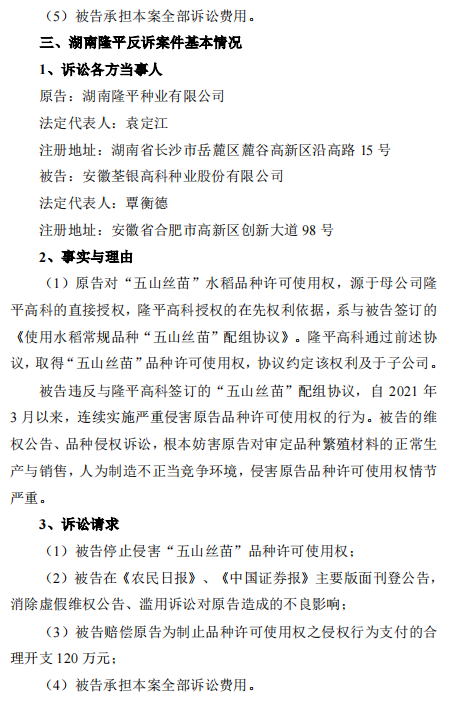 4月11日,隆平高科全資子公司湖南隆平收到安徽省高級人民法院送達(dá)的《民事裁定書》[(2022)皖民轄89號],荃銀高科以侵害植物新品種權(quán)為由向湖南隆平提起訴訟。基于荃銀高科的起訴嚴(yán)重侵害了湖南隆平的品種許可使用權(quán),因此湖南隆平提起了反訴。