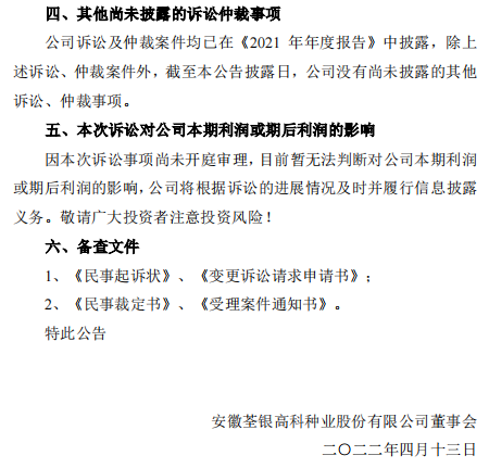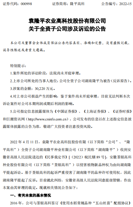 4月13日,隆平高科、荃銀高科雙雙發(fā)布公告,涉及3億元訴訟事項(xiàng)!