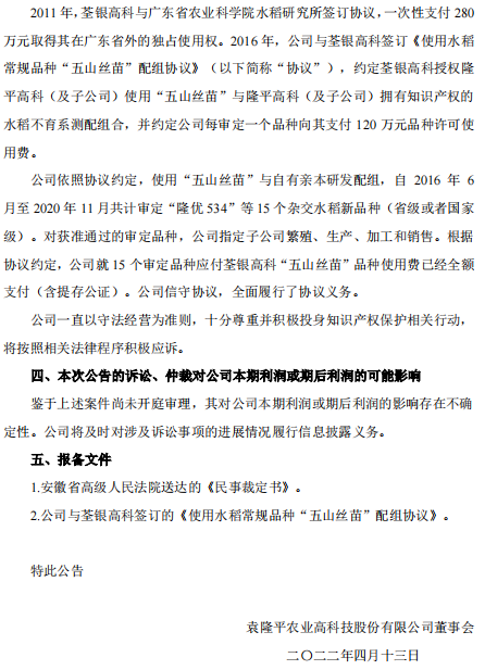 公司依照協(xié)議約定,使用“五山絲苗”與自有親本研發(fā)配組,自2016年6月至2020年11月共計(jì)審定“隆優(yōu)534”等15個(gè)雜交水稻新品種(省級或者國家級)。對獲準(zhǔn)通過的審定品種,公司指定子公司繁殖、生產(chǎn)、加工和銷售。根據(jù)協(xié)議約定,公司就15個(gè)審定品種應(yīng)付荃銀高科“五山絲苗”品種使用費(fèi)已經(jīng)全額支付(含提存公證)。公司信守協(xié)議,全面履行了協(xié)議義務(wù)。
