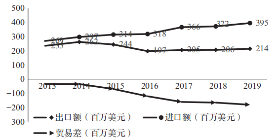 中國雖然是國際第二大種子市場國,但出口額較低,且貿(mào)易逆差較大。其中2019年中國種子出口量3.48萬t,出口額2.14億美元,出口額排全球第15位;進口量7.07萬t,進口額3.95億美元。貿(mào)易逆差由2013年的0.34億美元擴大到2019年的1.81億美元(圖2)。