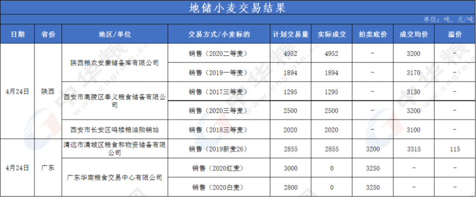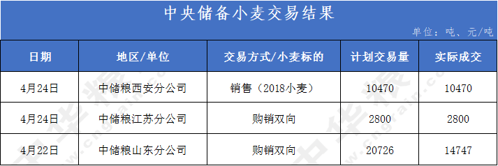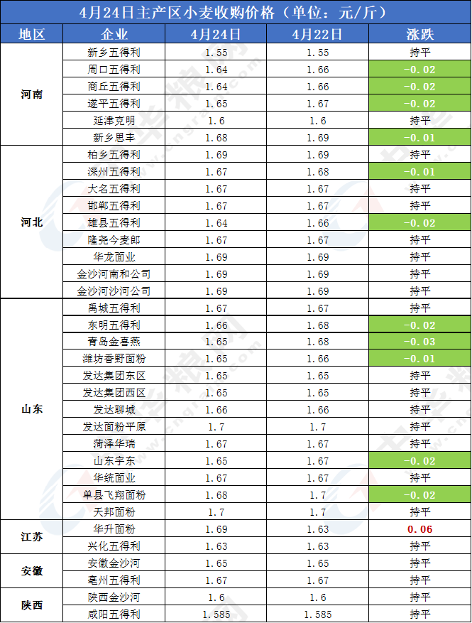 4月24日主產(chǎn)區(qū)小麥收購價格