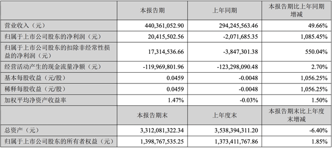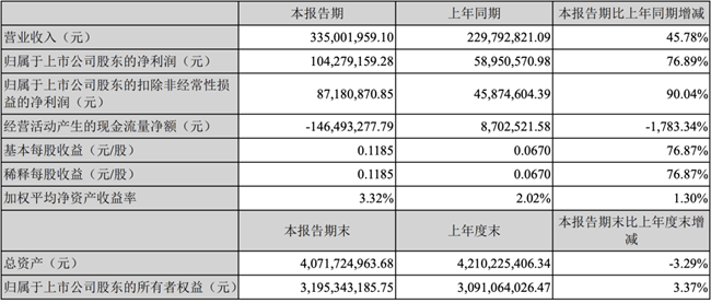 報(bào)告期內(nèi)公司實(shí)現(xiàn)營業(yè)收入335,001,959.10元,同比增長45.78%;主要原因是公司銷售量較上年同期增長影響所致。歸屬于上市公司股東的凈利潤104,279,159.28元,同比增長76.89%,主要原因是公司盈利能力提升所致。