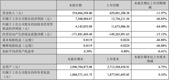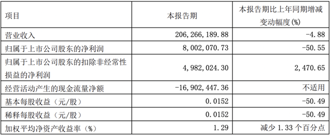 報(bào)告期內(nèi)公司實(shí)現(xiàn)營業(yè)收入206,266,189.88元,同比下滑4.88%;主要系報(bào)告期銷售減少所致。歸屬于上市公司股東的凈利潤8,002,070.73元,同比下滑50.55%,主要系報(bào)告期實(shí)現(xiàn)的凈利潤減少所致。