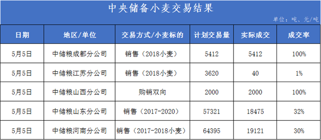 5月5日中儲(chǔ)糧山東分公司計(jì)劃銷售2017-2020年小麥57321噸,成交18475噸,成交率32.2%。底價(jià)3180-3300元/噸,成交價(jià)3240-3315元/噸。
