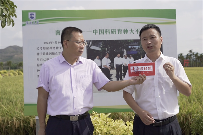 海南大學(xué)三亞南繁研究院黨委書記鄭中兵(左)和三亞市農(nóng)業(yè)農(nóng)村局局長(zhǎng)柯用春(右)在直播現(xiàn)場(chǎng)