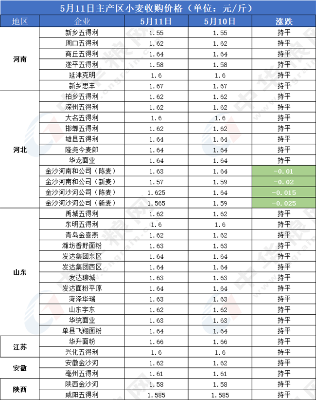 河北金沙河陳麥價格:沙河公司1.625元/斤,南和公司1.63元/斤。2022年新季小麥?zhǔn)召弮r格一天落價兩次,累計(jì)2分,其中沙河公司1.565元/斤,南和公司1.57元/斤。(7日1.63,8日1.6,9日1.59)