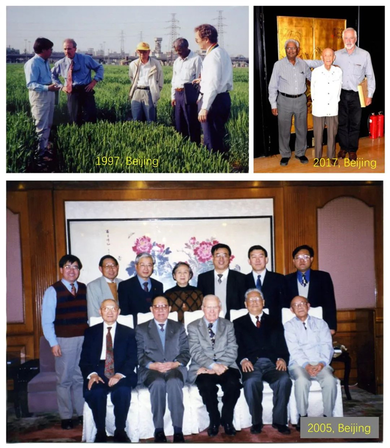 圖5 莊巧生先生主持和參與中國(guó)-CIMMYT的合作。上圖:莊先生接待來(lái)訪的CIMMYT主任和其他客人。下圖:莊先生(前排右一)與布勞格博士(前排中)等人在北京。照片由何中虎博士(現(xiàn)任CIMMYT-中國(guó)辦事處主任;后排左一)提供