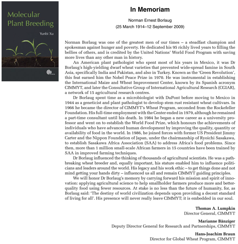 2006年,我加盟CIMMYT之后入住的第一個(gè)公寓就在布勞格博士的樓下。每天早上去食堂,因?yàn)槿松?,大部分時(shí)間都可以和布勞格一起吃飯聊天,他談得最多的就是改革開(kāi)放之后中國(guó)發(fā)生的巨大變化以及他在墨西哥和東南亞的育種經(jīng)歷。我也與他分享多年來(lái)一直在努力撰寫(xiě)的Molecular Plant Breeding專(zhuān)著。談到興頭上,我便邀請(qǐng)他幫我為專(zhuān)著撰寫(xiě)前言。他滿(mǎn)口答應(yīng),并親自作序。由于工作繁忙,這本書(shū)的撰寫(xiě)前前后后共花了將近十年的時(shí)間,等到正式出版時(shí),布勞格博士已經(jīng)與世長(zhǎng)辭。為了紀(jì)念他,我邀請(qǐng)CIMMYT時(shí)任主任,玉米和小麥項(xiàng)目的主任一起撰寫(xiě)了短文,刊登在Molecular Plant Breeding開(kāi)篇的扉頁(yè)上(圖9-10)。