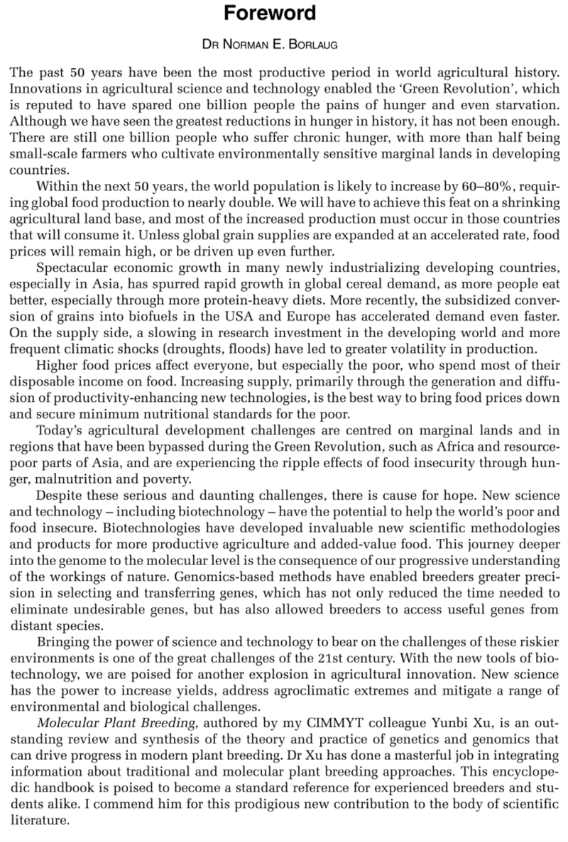 圖10 諾曼·布勞格博士為Molecular Plant Breeding撰寫(xiě)的序言