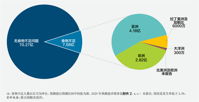 2020 年,世界饑餓人口半數(shù)以上(4.18 億)生活在亞洲,三分之一以上(2.82 億) 生活在非洲。資料來源:聯(lián)合國(guó)糧農(nóng)組織。