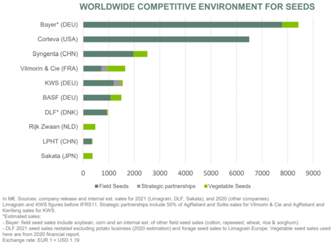 2021年全球十強(qiáng)種企營(yíng)收表??梢钥闯?,排名前二的拜耳與科迪華占據(jù)了大部分市場(chǎng)。數(shù)據(jù)來源:VilMorin & Cie(利馬格蘭)。