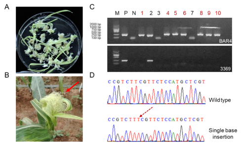 圖C 混合轉(zhuǎn)化后優(yōu)質(zhì)轉(zhuǎn)化苗分離情況;圖D 優(yōu)質(zhì)轉(zhuǎn)化苗基因編輯情況