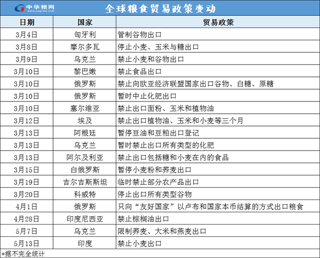 更為糟糕的是,除了兩大小麥出口國俄羅斯、烏克蘭,以及小麥生產(chǎn)大國印度外,哈薩克斯坦、塞爾維亞、摩爾多瓦等國家也紛紛開始禁止小麥出口。
