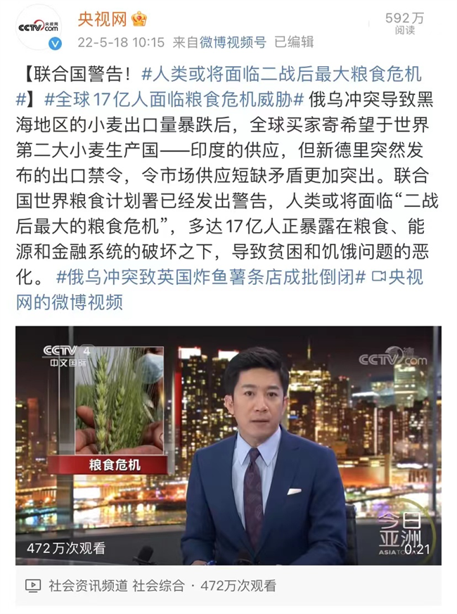 當前全球糧食市場供應短缺矛盾突出,聯(lián)合國世界糧食計劃署發(fā)出警告,人類或?qū)⒚媾R“二戰(zhàn)后最大的糧食危機”,多達17億人正暴露在糧食、能源和金融系統(tǒng)的破壞之下,導致貧困和饑餓問題的惡化。