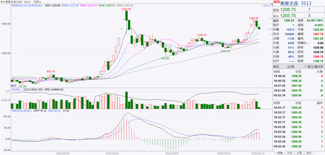 以小麥為例,2022年以來,CBOT小麥主力合約連翻上漲,尤其是俄烏沖突后,小麥年內(nèi)漲幅一度超過70%,3月8日更是創(chuàng)下歷史新高,達到1363.5美分/蒲式爾。目前仍維持上漲趨勢,5月17日達到階段性高點1284美分/蒲式爾。