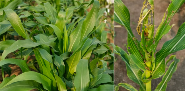 LP007(左)田間抗草地貪夜蛾優(yōu)異表現(xiàn),右為常規(guī)對照品種。