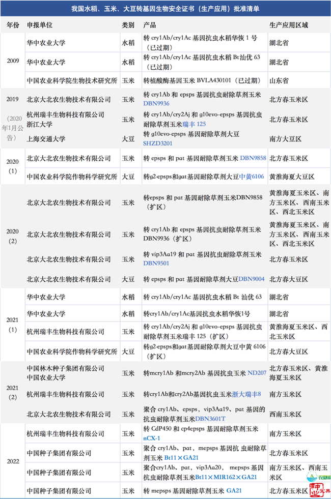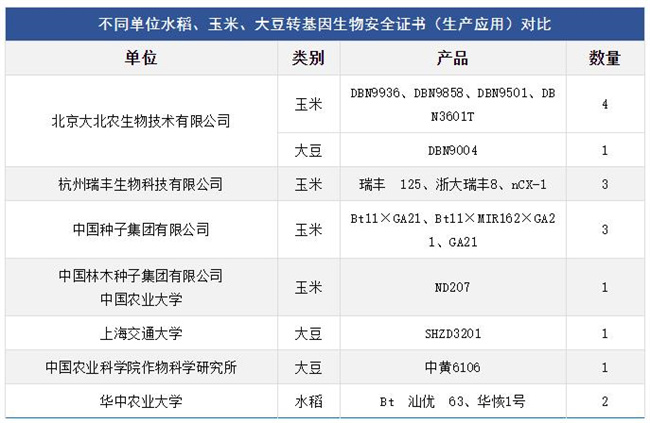 至此,我國(guó)已有 11 個(gè)轉(zhuǎn)基因抗蟲(chóng)耐除草劑玉米和 3 個(gè)轉(zhuǎn)基因耐除草劑大豆獲得了生產(chǎn)應(yīng)用安全證書(shū)。