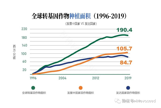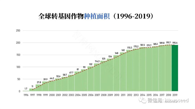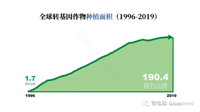 轉(zhuǎn)基因作物于 1996 年開(kāi)始商業(yè)化種植,至今已經(jīng) 26 年,全球轉(zhuǎn)基因作物種植面積除了 2015 年和 2019 年以外,都是逐年增加的, 2019 年全球種植轉(zhuǎn)基因作物 1.904 億公頃,是 1996 年 170 萬(wàn)公頃的 112 倍。