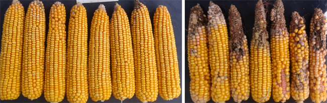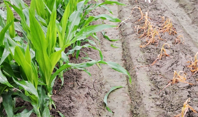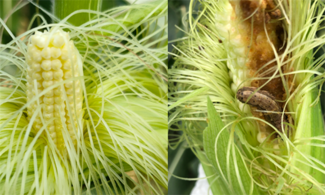 LP007(左)田間抗草地貪夜蛾優(yōu)異表現(xiàn),右為常規(guī)對(duì)照品種。