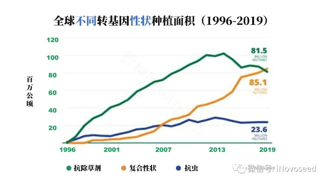 從 1996 年至 2019 年,轉(zhuǎn)基因性狀一直主要是抗除草劑和抗蟲(chóng),商業(yè)化的性狀有單一抗除草劑、單一抗蟲(chóng)和既抗除草劑又抗蟲(chóng)(雙抗)三種。雙抗性狀普及很快,2019 年面積超過(guò)單一抗除草劑性狀,成為第一。單一抗蟲(chóng)、單一抗除草劑性狀的種植面積分別從2013、2014 年起開(kāi)始下滑。