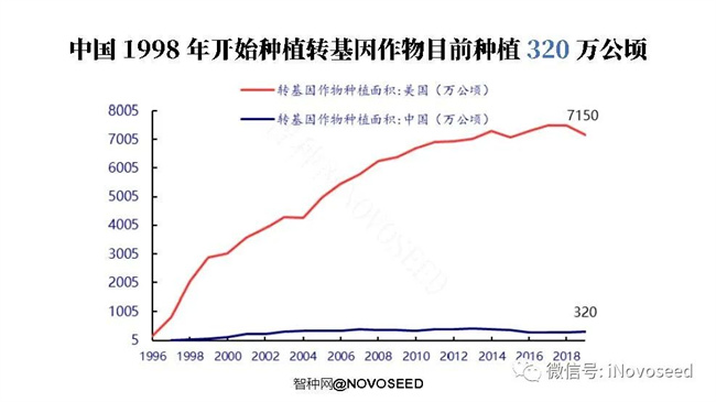 中國(guó) 1998 年開(kāi)始種植轉(zhuǎn)基因棉花,2006 年開(kāi)始種植轉(zhuǎn)基因木瓜,之前批準(zhǔn)過(guò)煙草、番茄、辣椒、楊樹(shù),至今僅種植棉花和木瓜。中國(guó)曾是世界上最早種植轉(zhuǎn)基因作物的國(guó)家,早于美國(guó)數(shù)年,由于美國(guó)的干預(yù),活生生地扼殺了中國(guó)的技術(shù)領(lǐng)先。中國(guó)也成為全球第四大轉(zhuǎn)基因作物種植國(guó),但 2000 年后不斷下滑,2019 年下滑至第七位,與巴拉圭、南非為伍。中國(guó)轉(zhuǎn)基因面積全球占比 2004 年最高,為 4.57%;2019 年僅占1.68%。