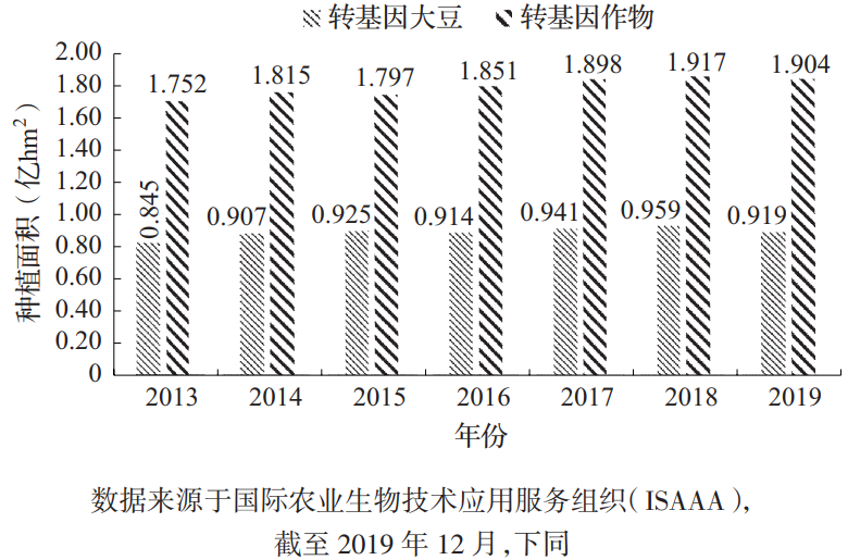 圖1 2013-2019年全球轉(zhuǎn)基因作物和轉(zhuǎn)基因大豆種植面積