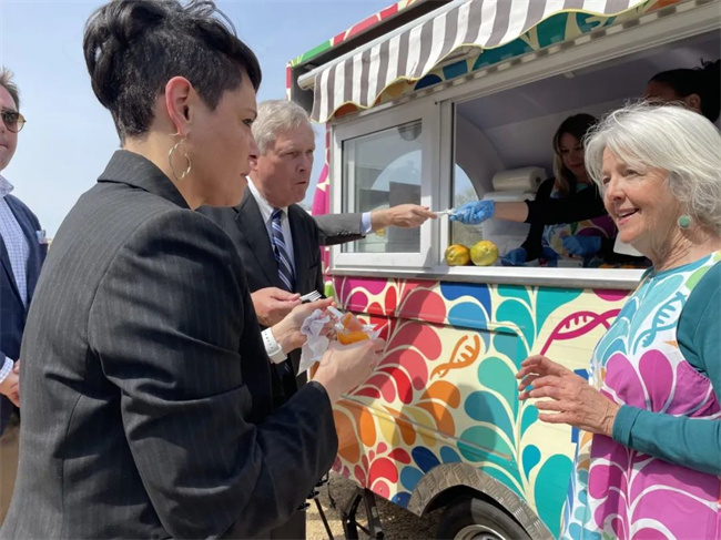 美國(guó)農(nóng)業(yè)部長(zhǎng)Tom Vilsack和副部長(zhǎng)Jewel Bronaugh博士在集市展位前品嘗轉(zhuǎn)基因水果。圖片來源:allianceforscience.cornell.edu。
