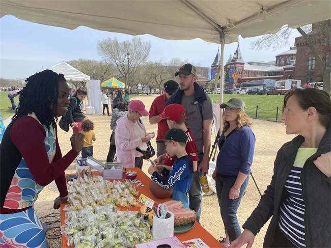 美國(guó)華盛頓廣場(chǎng)的一個(gè)轉(zhuǎn)基因食品科普市集活動(dòng),工作人員在介紹防褐變蘋果。圖片來源:allianceforscience.cornell.edu。
