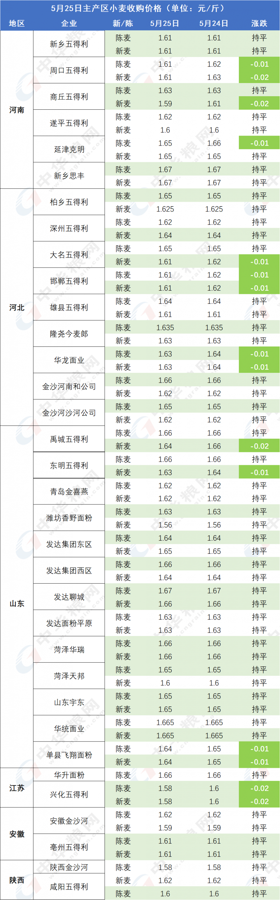 5月25日,隨著豫南、江蘇、安徽、湖北等地新麥上量增加,面粉加工企業(yè)繼續(xù)下調(diào)收購價格,部分面粉廠收購價格跌破1.6。河北、山東面粉廠收購價格基本在1.6以上。