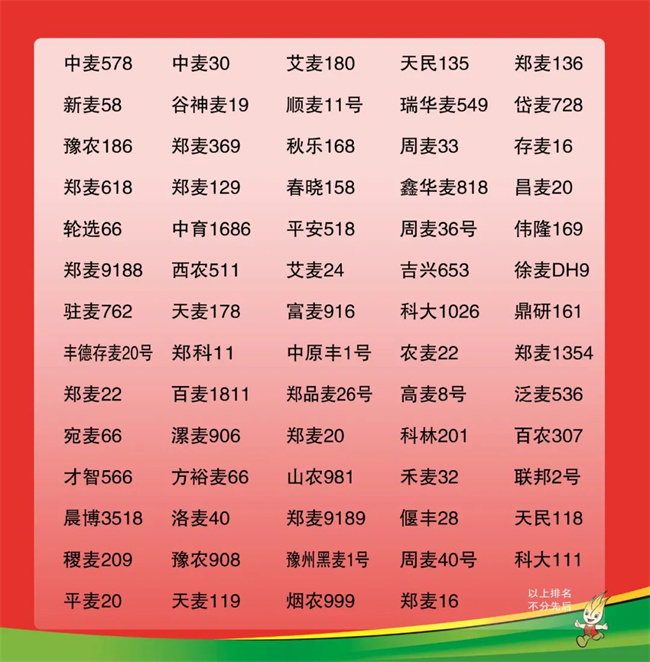 69個(gè)專家組推薦名單如下:中麥578、中麥30、艾麥180、天民135、鄭麥136、新麥58、谷神麥19(國(guó)禾麥19)、順麥11號(hào)、瑞華麥549、岱麥728、豫農(nóng)186、鄭麥369、秋樂(lè)168、周麥33、存麥16、鄭麥618、鄭麥129、春曉158、鑫華麥818、昌麥20、輪選66、中育1686、平安518、周麥36號(hào)、偉隆169、鄭麥9188、西農(nóng)511、艾麥24、吉興653、徐麥DH9、駐麥762、天麥178、富麥916、科大1026、鼎研161、豐德存麥20號(hào)、鄭科11、中原豐1號(hào)、農(nóng)麥22、鄭麥1354、鄭麥22、百麥1811、鄭品麥26號(hào)、高麥8號(hào)、泛麥536、宛麥66、漯麥906、鄭麥20、科林201、百農(nóng)307、才智566、方裕麥66、山農(nóng)981、禾麥32、聯(lián)邦2號(hào)、晨博3518、洛麥40、鄭麥9189、偃豐28、天民118、稷麥209、豫農(nóng)908、豫州黑麥1號(hào)、周麥40號(hào)、科大111、平麥20、天麥119、煙農(nóng)999、鄭麥16。(以上排名不分先后)