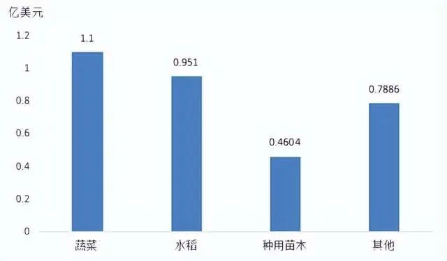 2021年,我國農(nóng)作物種子出口貿(mào)易額3.3億美元,主要品種包括蔬菜種子(1.1億美元,占比33.3%)、水稻種子(9510萬美元,占比28.8%)、種用苗木(4604萬美元,占比14%),其他種子(7886萬美元,占比23.9%)。水稻種子為自主優(yōu)勢品種,出口約40個(gè)國家和地區(qū),其他多為外繁品種。