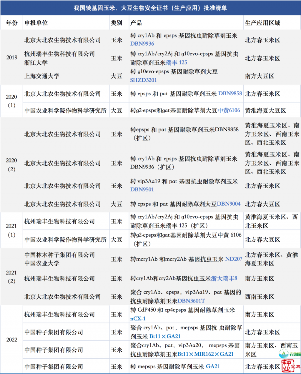4月29日,農(nóng)業(yè)農(nóng)村部發(fā)布了2022年第一批轉(zhuǎn)基因生產(chǎn)應(yīng)用安全證書,其中包括4個轉(zhuǎn)基因玉米。截至目前,我國已有11個轉(zhuǎn)基因抗蟲耐除草劑玉米和3 個轉(zhuǎn)基因耐除草劑大豆獲得生產(chǎn)應(yīng)用安全證書。