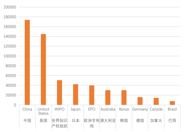 在地區(qū)分布上,中國(guó)和美國(guó)是申請(qǐng)數(shù)量最多的兩個(gè)國(guó)家,遠(yuǎn)遠(yuǎn)超過(guò)第三名的世界知識(shí)產(chǎn)權(quán)組織和其他國(guó)家存在明顯差距。