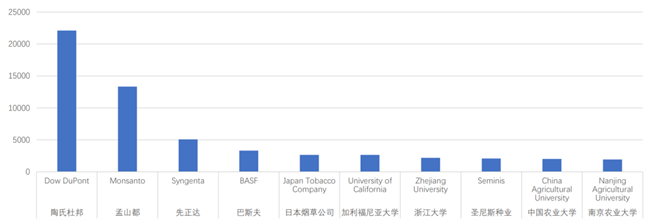 一是專利權(quán)人多為科研機(jī)構(gòu)和高校。在全球排名前10的專利權(quán)人中,有6家是跨國(guó)企業(yè),4個(gè)是研究機(jī)構(gòu)或高校。世界三大種業(yè)巨頭陶氏杜邦、孟山都、先正達(dá)在申請(qǐng)量上優(yōu)勢(shì)明顯。但我國(guó)在該領(lǐng)域?qū)@麛?shù)量上位居前列的機(jī)構(gòu)均是高校,包括浙江大學(xué)、中國(guó)農(nóng)業(yè)大學(xué)和南京農(nóng)業(yè)大學(xué)。