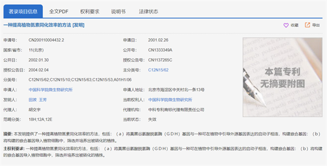 在專利信息查詢網(wǎng)站上輸入專利號(hào)CN01104432.2,顯示專利名稱為一種提高植物氮素同化效率的方法。