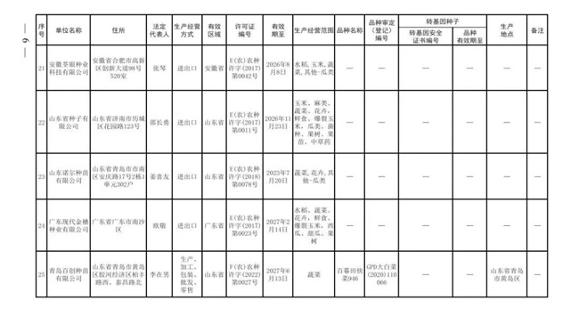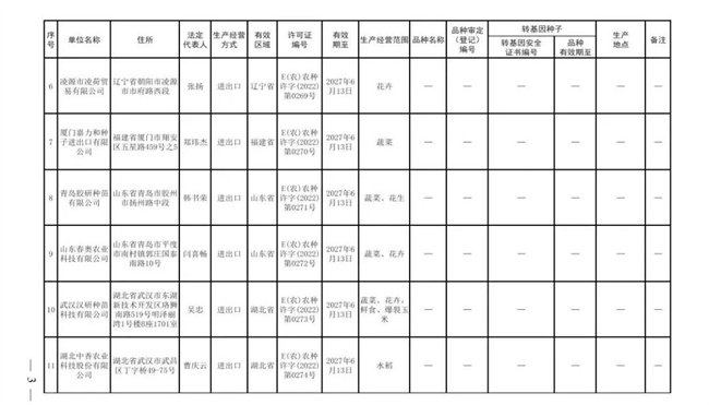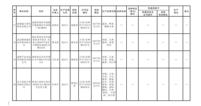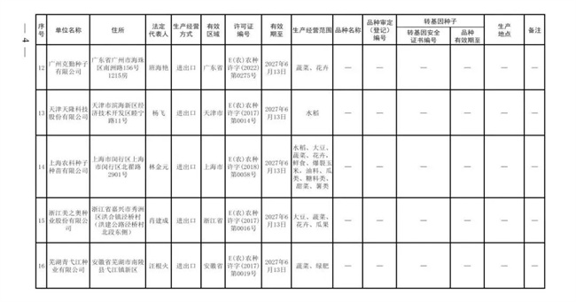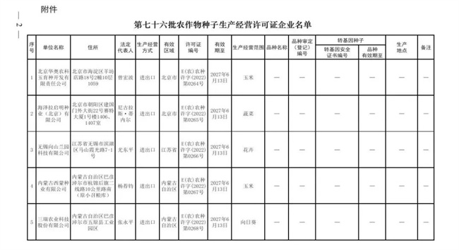根據(jù)《中華人民共和國種子法》《農(nóng)業(yè)轉(zhuǎn)基因生物安全管理?xiàng)l例》和《農(nóng)作物種子生產(chǎn)經(jīng)營許可管理辦法》等有關(guān)規(guī)定,批準(zhǔn)發(fā)放北京華奧農(nóng)科玉育種開發(fā)有限責(zé)任公司等30家企業(yè)農(nóng)作物種子生產(chǎn)經(jīng)營許可證(詳見附件)。