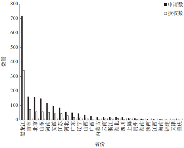 圖3 全國各省大豆新品種權(quán)申請與授權(quán)情況