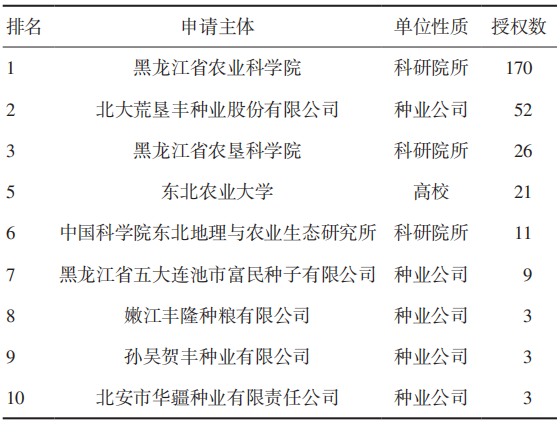 表1 黑龍江省大豆植物新品種權(quán)授權(quán)數(shù)排名前10位的申請主體