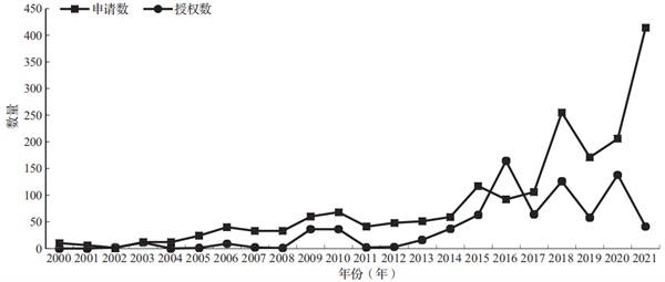 圖1 2000-2021年全國大豆新品種權(quán)申請與授權(quán)情況